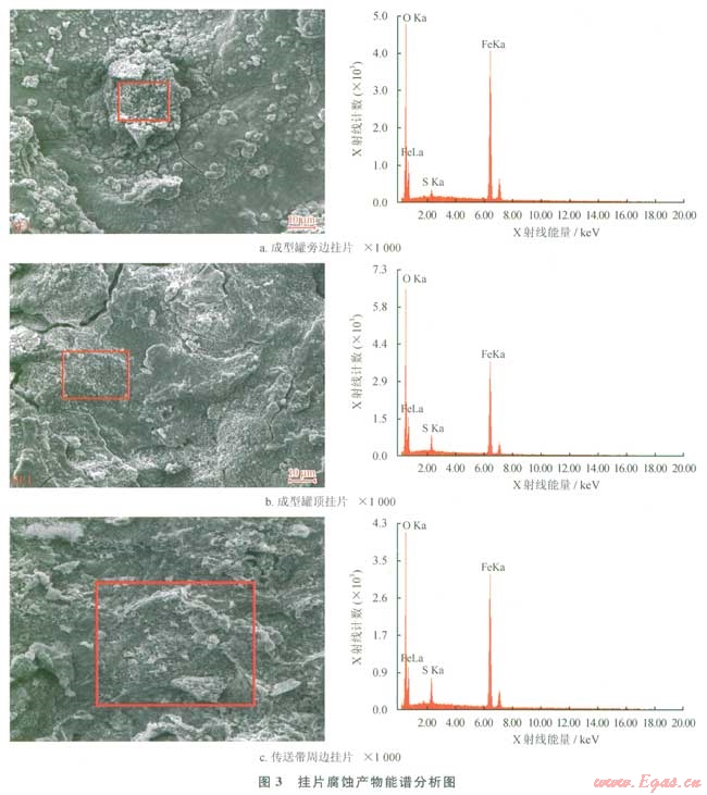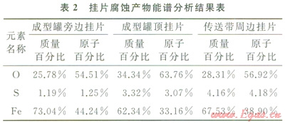 2)通過掃描電鏡觀察,發(fā)現(xiàn)腐蝕掛片表面形成片狀腐蝕產(chǎn)物;能譜顯示腐蝕產(chǎn)物主要含Fe、O元素和少量S元素。分析其腐蝕機理,腐蝕產(chǎn)物主要呵能是FeOOH、FeSO4、Fe2O3和Fe3O4。