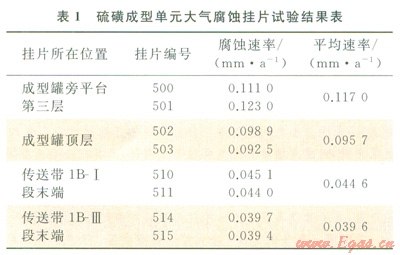 但在水造粒成型工藝中,液硫和硫磺顆粒本身具有腐蝕性,若液硫未脫氣或脫氣效果不好,則工藝介質(zhì)的酸性可能很強,酸性濕氣進(jìn)入大氣中也具有一定的腐蝕性,對設(shè)備管線安全運行構(gòu)成威脅。國內(nèi)專門針對硫磺成型設(shè)備的腐蝕雖已有報道[4-7],但對硫磺成型設(shè)備外部結(jié)構(gòu)鋼、閥門、硫磺顆粒傳送帶周圍鋼結(jié)構(gòu)的大氣腐蝕則未引起足夠的重視。經(jīng)過實地腐蝕調(diào)研,筆者發(fā)現(xiàn)硫磺成型單元外部結(jié)構(gòu)鋼、閥門、硫磺顆粒傳送帶周圍鋼結(jié)構(gòu)以及頂棚等都存在腐蝕隱患。本文采用現(xiàn)場掛片法對硫磺成型單元大氣腐蝕行為進(jìn)行分析,擬為凈化廠硫磺回收裝置的安全運行提供技術(shù)依據(jù)。