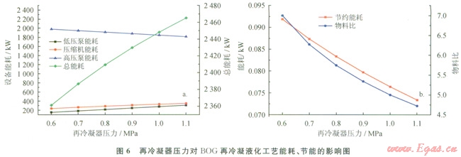再冷凝器壓力對BOG再冷凝液化工藝能耗、節(jié)能的影響見圖6。從圖6可以看出,隨著再冷凝器壓力的升高,即低壓泵和壓縮機壓力的升高,BOG再冷凝液化工藝所消耗的能量相應(yīng)增加,則BOG再冷比增加,當(dāng)LNG接收站處于外輸量最小工況時,操作困難。因此,在實際生產(chǎn)中,再冷凝器的壓力一般控制在0.7~O.9MPa[8]。