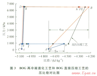 對比2種工藝的能耗,以氣源型LNG接收站為例進行分析,繪制出2種工藝的壓比焓圖(圖3)。