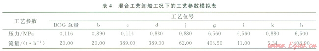 模擬混合工藝卸船工況下的流程參數(shù)見表4,在卸船工況下再冷凝器入口的LNG流量為62.00 t/h,在再冷凝器安全運行的同時,盡可能降低高壓壓縮機的入口流量,從而節(jié)約總能耗。低壓壓縮機設(shè)計負(fù)荷為6.7t/h,為統(tǒng)一設(shè)備運行參數(shù),并節(jié)約投資成本,再冷凝器入口LNG流量的設(shè)定以滿足高壓壓縮機入口BOG流量小于6.7t/h為限。