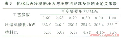 從圖6-b及表3可以看出,工藝優(yōu)化前再冷凝器壓力為0.88MPa時的物料比與工藝優(yōu)化后再冷凝器壓力為0.65MPa時的物料比接近,而壓縮機能耗則由302.4kW降為246.9kW,降低l8.2%,節(jié)能效果明顯。