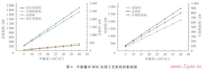 1)BOG再冷凝液化工藝的能耗均小于BOG直接壓縮工藝的能耗。針對2種BOG處理工藝,外輸量的改變幾乎不影響再冷凝器的節(jié)能效果,但當(dāng)BOG量較大時,BOG再冷凝液化工藝的節(jié)能效果更顯著。