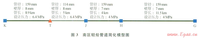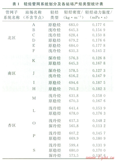 某油氣田輕烴管網(wǎng)系統(tǒng)為枝狀的網(wǎng)絡(luò)結(jié)構(gòu),總長度為410.9km,包含12條輸烴管道、l6個(gè)油氣處理站、輸烴管道38條(管徑為76~219mm)。經(jīng)過多年的擴(kuò)建改造,該輕烴管網(wǎng)系統(tǒng)的管道、產(chǎn)烴站場逐漸增多,廢棄、在用、在建管道交錯(cuò)。為便于研究,根據(jù)管道之間的地域因素和水力相關(guān)性,將其劃分為3個(gè)互相獨(dú)立的子系統(tǒng),分別進(jìn)行研究。