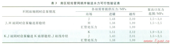 根據(jù)上述提出的南區(qū)輕烴管網(wǎng)順序輸送方案,分表2南區(qū)輕烴管網(wǎng)順序輸送外輸泵運(yùn)行方案表別對烴類進(jìn)入輕烴總庫罐區(qū)和實(shí)現(xiàn)越庫2種方式進(jìn)行水力可行性驗(yàn)證(表3)。由表3可知,各管道并未超壓,且外輸泵能夠提供輕烴順序輸送所需要的能量,因此該方案具有水力可行性。