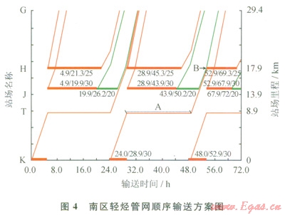 綜合考慮各站場產(chǎn)烴類型、產(chǎn)烴量、泵機(jī)組外輸量、啟泵時(shí)間需求、管道承壓能力、輸烴順序、混烴界面等[11],計(jì)算得出適用于南區(qū)輕烴管網(wǎng)的順序輸送方案(圖4)[12]。圖4的橫軸表示輸送時(shí)間,縱軸表示各站場距離首站的距離,圖中的有色矩形表示輕烴注入的時(shí)間窗(矩形長方向的起點(diǎn)為開始注入時(shí)間,終點(diǎn)為結(jié)束注入時(shí)間),時(shí)間窗的顏色表示注入輕烴的類型,綠色代表淺冷烴,紅色代表原穩(wěn)烴。另外,時(shí)間窗的高度和流量大小成正比。時(shí)間窗周圍顯示該批次的注入工況,如“4.9/21.3/25”表示該時(shí)間窗注入開始于4.9h,結(jié)束于21.3h,流量為25m2/h。T節(jié)點(diǎn)輕烴的存儲時(shí)間依據(jù)各站場注烴時(shí)間而定,如,K站場注入的原穩(wěn)烴在T節(jié)點(diǎn)暫儲(見圖4中A虛線處),以使K站原穩(wěn)烴、J站淺冷烴、H站原穩(wěn)烴產(chǎn)生的混烴量最少(見圖4中B點(diǎn))。