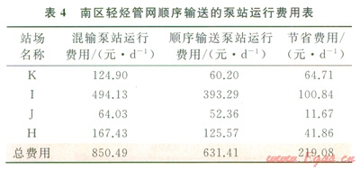 結(jié)合現(xiàn)場數(shù)據(jù),從泵站運(yùn)行費(fèi)用和混烴量兩方面來驗(yàn)證南區(qū)輕烴管網(wǎng)順序輸送方案的經(jīng)濟(jì)性(表4)[13]。表4表明,南區(qū)輕烴管網(wǎng)實(shí)現(xiàn)順序輸送后,可節(jié)省泵站運(yùn)行費(fèi)用76678元/a。