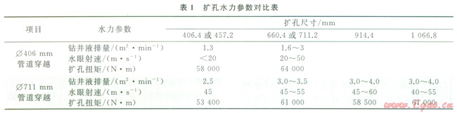 Æ406mm管道穿越擴孔施工時發(fā)現(xiàn)鉆井液排量低于2m2/min、水眼射速低于50m/s時擴孔扭矩大,鉆具磨損快。Æ711mm管道穿越擴孔施工時調(diào)整了施工參數(shù),改進了擴孔器選型,使得擴孔扭矩得到了有效控制,鉆屑及時排除,水力切削充分,鉆具幾乎沒有磨損,加快了施工進度,保證了每次擴孔一次性成功。根據(jù)3次管道穿越對鉆進參數(shù)的調(diào)整情況,并結合現(xiàn)場實際可以達到的施工條件,最優(yōu)的鉆進參數(shù)統(tǒng)計結果見表2。