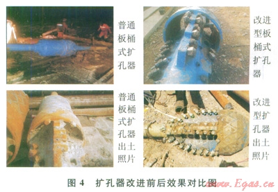 2)采用改進型板桶式擴孔器,提高了擴孔效率,降低了施工風險(圖4)。采用新擴孔器后,在Æ711mm-B管道穿越四級擴孔施工中均是一次性完成了擴孔,出土后的擴孔器磨損很小,擴孔效果極好。根據(jù)B管的擴孔經(jīng)驗,在改進擴孔器切割方式的前提下,Æ711mm-A線進一步優(yōu)化了擴孔器水嘴的配置,使得鉆井液有效輔助切削,減小了擴孔扭矩,將原來的四級擴孔減少到三級(660.4mm、914.4mm、l066.8mm),提高了施工效率,節(jié)約了工期。