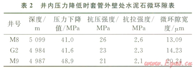 川中地區(qū)高壓天然氣井因Æl77.8mm尾管固井后,采用較低密度鉆井液替換井內(nèi)鉆井液鉆開目的層而使作用在井內(nèi)套管的內(nèi)壓力大幅度降低。該區(qū)塊Æ177.8mm尾管固井時鉆井液密度約為2.20g/cm3,而下一次開鉆鉆進時,鉆井液密度降至1.35g/cm3左右。M8、G2、M9井Æl77.8mm尾管固井,氣層封固質(zhì)量優(yōu)良,候凝過程未發(fā)生氣竄,但井內(nèi)壓力大幅度下降后,喇叭口竄氣。該區(qū)塊水泥石楊氏模量10GPa,泊松比0.19,其余計算條件及結(jié)果如表2所示。以套管壁處水泥環(huán)徑向拉應(yīng)力達到抗拉強度為形成微環(huán)隙的臨界條件[7-8],由公式(3),計算出井內(nèi)壓力下降幅度超過40MPa后,3口井形成寬度l3.09~20.24mm的微環(huán)隙,密封能力顯著降低。