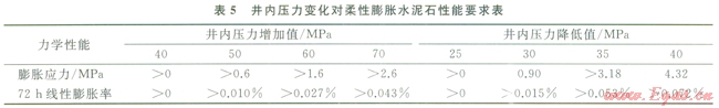 井下作業(yè)公司柔性自應(yīng)力水泥石能在高圍壓條件下膨脹,產(chǎn)生0.5~3.0MPa膨脹壓應(yīng)力,楊氏模量在5~7GPa,泊松比約為0.19,抗拉強度在2.5~3.5MPa。當(dāng)固井后井內(nèi)壓力增加時,通過釋放壓縮應(yīng)力,減小水泥環(huán)周向拉應(yīng)力,避免拉伸破壞,同時外觀體積微膨脹,可阻止微環(huán)隙形成。由公式(1)、(2)計算出表5所示不同井內(nèi)壓力變化情況下柔性膨脹水泥石體積膨脹要求。該水泥漿體系在相國寺儲氣庫井技術(shù)套管、頁巖氣井的油層套管固井中得到了成功應(yīng)用,固井質(zhì)量優(yōu)質(zhì),在經(jīng)過試壓、大型體積壓裂作業(yè)后,環(huán)空封固質(zhì)量好,未發(fā)生氣竄。