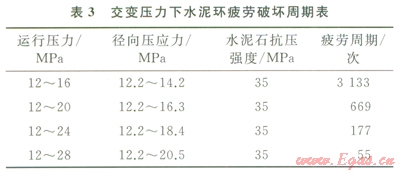 地下儲氣庫井天然氣注入和采出的作業(yè)使作用在井內(nèi)套管的內(nèi)壓力交替變化。這種交變壓力可能引起水泥石內(nèi)部固有的微裂紋緩慢擴展、連通,導(dǎo)致水泥石疲勞破壞[9-11]。以井深2107m的儲氣庫井為例,水平地應(yīng)力30MPa,井徑215.9mm,套管直徑l77.8mm,壁厚11.51mm,運行壓力12~28MPa,水泥石楊氏模量l0GPa,泊松比0.19,根據(jù)水泥石疲勞破壞方程[12]計算出交變壓力作用下普通水泥石疲勞破壞周期如表3所示。儲氣庫井注采氣過程中運行壓力越高,普通水泥環(huán)越易疲勞破壞。當(dāng)達到最大運行壓力時,只需數(shù)十次注采周期,水泥環(huán)即發(fā)生疲勞破壞。
