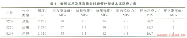 該作業(yè)使作用在井內(nèi)套管的內(nèi)壓力大幅度升高。四川盆地頁巖氣井Æl39.7mm油層套管固井后(套管壁厚9.17mm,井眼尺寸215.9mm)對套管柱試壓及壓裂作業(yè),井口壓力高達60MPa。N203井等井固井質(zhì)量優(yōu)質(zhì)率100%,但試壓或光套管壓裂作業(yè)后均出現(xiàn)環(huán)空帶壓。該區(qū)塊水泥石楊氏模量l0GPa,泊松比0.19,其余計算條件及結(jié)果如表l所示,由公式(1)和(2),試壓或壓裂作業(yè)后,套管壁處水泥環(huán)周向應(yīng)力均超過抗拉強度,發(fā)生拉伸破壞,導(dǎo)致水泥環(huán)密封失效。