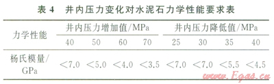 彈性水泥石具備了低楊氏模量、彈性變形能力強的特點,能與套管、井壁協(xié)調(diào)變形,有效卸載,大幅度降低微裂隙及微環(huán)隙形成的可能性。由公式(1)、(2)計算出當(dāng)井內(nèi)壓力變化時,為避免水泥環(huán)破壞,需將水泥石楊氏模量降至適當(dāng)范圍(表4)。以斯倫貝謝為代表的典型彈性水泥石,楊氏模量在3.5~5.5GPa,泊松比約為0.22,抗拉強度在2.2~2.5MPa,在儲氣庫得到成功應(yīng)用,固井質(zhì)量優(yōu)質(zhì),在經(jīng)過試壓及下一次開鉆鉆進井內(nèi)壓力變化后,固井質(zhì)量依然良好,未出現(xiàn)氣竄。