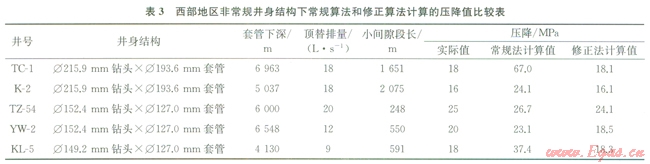 建立的小間隙注水泥環(huán)空流動(dòng)計(jì)算模型在西部地區(qū)多口非常規(guī)井的注水泥平衡壓力設(shè)計(jì)計(jì)算中加以了應(yīng)用?,F(xiàn)場(chǎng)應(yīng)用結(jié)果表明:小間隙注水泥環(huán)空流動(dòng)計(jì)算模型計(jì)算出的壓力值接近實(shí)際施工壓力值。表3為西部地區(qū)非常規(guī)井身結(jié)構(gòu)下采用常規(guī)算法和小間隙環(huán)空流動(dòng)計(jì)算修正方法計(jì)算的壓降值和施工實(shí)際壓力值的比較情況。