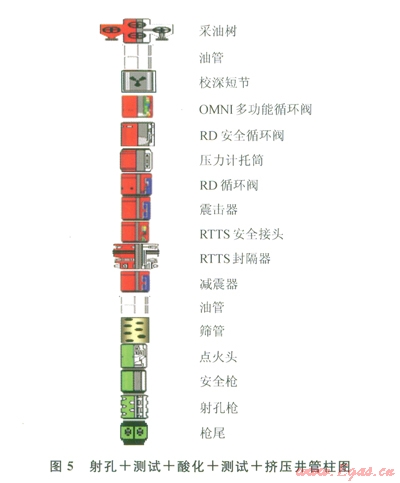 針對阿姆河右岸氣田的地質(zhì)特性以及酸壓增產(chǎn)的需求,結合以上4種典型的高溫高壓井測試管柱的技術特點,本著簡單實用的原則,進行優(yōu)化設計。得出以下管柱優(yōu)化方案——優(yōu)化管柱:射孔—測試—酸化—測試—擠壓井管柱(圖5)。