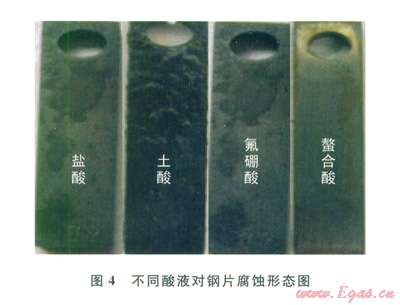 從圖4中可以看出,螯合酸腐蝕不是很明顯,表面附著少許薄膜,且表面光鮮明亮,而其他3種無機酸液對鋼片腐蝕嚴重,表面有黑色的物質(zhì),同時具有明顯的腐蝕溝槽。