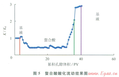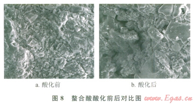 實驗結(jié)果表明:經(jīng)過螯合酸酸化后巖心滲透率顯著提高,滲透率提高將近3倍,而經(jīng)過土酸酸化后巖心滲透率降低,降低幅度達50%,且使用土酸進行酸化流動過程中出現(xiàn)巖心脫砂現(xiàn)象,而螯合酸沒有出現(xiàn)脫砂問題,電鏡掃描結(jié)果也顯示土酸酸化后巖心的骨架結(jié)構(gòu)破壞,表面膠結(jié)強度降低,黏土礦物結(jié)構(gòu)遭到破壞,所以出現(xiàn)砂現(xiàn)象。通過掃描螯合酸酸化流動前后巖心端面發(fā)現(xiàn),巖石骨架結(jié)構(gòu)未被破壞,且出現(xiàn)明顯的溶蝕孔道,從掃描電鏡看出酸化流動后巖石的膠結(jié)情況完好,未出現(xiàn)結(jié)構(gòu)破壞現(xiàn)象。