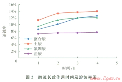 實驗設(shè)計了4種酸液與某油氣田沙河街組儲層的巖粉反應(yīng),對比在1h、2h、3h、4h酸液對巖粉的溶蝕率,以及最終的溶蝕率,研究螯合酸液體系的緩速性能。實驗溫度l30℃,實驗4種酸液分別為:10%HCl、10Y00 HCl+2%HF、10%HCl+8%HBF4、l0%螯合酸。實驗結(jié)果表明(圖2):鹽酸與巖粉反應(yīng)速率最快,溶蝕率最低,土酸與巖粉反應(yīng)溶蝕率最高,在2h反應(yīng)基本完成,氟硼酸溶蝕率比螯合酸略低;鹽酸溶蝕率基本保持在7.5%,土酸溶蝕率在2h變化較大,之后基本無很大變化,溶蝕率最高達l3.9%,螯合酸表現(xiàn)出明顯的緩速性能,隨著反應(yīng)時間延長,螯合酸溶蝕率逐漸升高,最高達l2.6%。