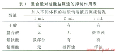從表l可以看出,氟鈦酸在第一次加入硅酸鈉溶液就產(chǎn)生微渾濁,土酸與氟鈦酸在第二次加入硅酸鈉就產(chǎn)生沉淀,氟硼酸出現(xiàn)少量渾濁,螯合酸在第三次加入硅酸鈉才出現(xiàn)微渾濁,說明螯合酸對硅酸鹽沉淀的抑制性能好。