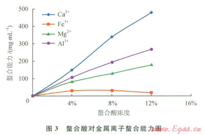 螯合酸對鈣離子螯合能力最強,對鐵離子螯合能力較弱,隨著螯合酸濃度的升高,對鈣、鎂、鋁螯合能力逐漸增強,當螯合酸濃度為l2%時,鈣離子螯合能力最高達到480mg/mL,鎂離子螯合能力180mg/mL,鋁離子螯合能力268mg/mL,對鐵離子螯合能力隨著螯合劑濃度增加而降低,濃度8%時鐵離子穩(wěn)定能力為30mg/mL,濃度l2%時為17mg/mL,綜合螯合酸對幾種金屬離子的蝥合能力,當螯合劑濃度為l0%,可以實現(xiàn)對4種金屬離子高效螯合(圖3)。