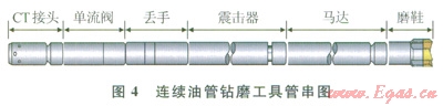 連續(xù)油管鉆磨橋塞工具管串為:卡瓦接頭+馬達(dá)頭總成+震擊器+馬達(dá)+磨鞋。其中馬達(dá)和磨鞋是其中的關(guān)鍵部分,直接影響了工具的使用壽命和鉆磨橋塞的效率(圖4)。