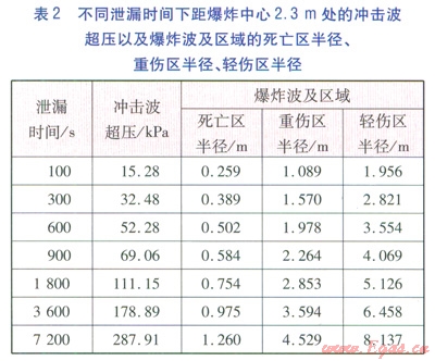 取環(huán)形縫隙泄漏流量為7.882×10-4m3/s規(guī)格為l5mm的燃?xì)夤艿?/font>[8],泄漏時(shí)間分別取l00、300、600、900、1800、3600、7200s。例:2.3m處Dp=52.28kPa,Dp=44kPa處>2.3m。沖擊波、爆炸波及區(qū)域破壞半徑采用不同方法計(jì)算,前者采用式(3)、(4)計(jì)算,后者采用式(5)~(7)計(jì)算。不同泄漏時(shí)間下距爆炸中心2.3m處(內(nèi)墻位置)的沖擊波超壓以及爆炸波及區(qū)域的死亡區(qū)半徑、重傷區(qū)半徑、輕傷區(qū)半徑見(jiàn)表2。