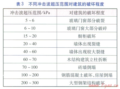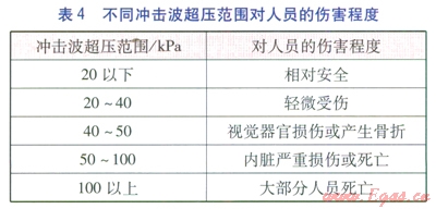 不同沖擊波超壓范圍對(duì)建筑物的破壞程度、對(duì)人體傷害程度分別見(jiàn)表3、4[5]。