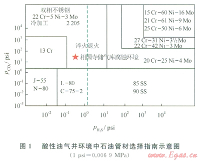 在相國寺儲氣庫運(yùn)行初期還存在少量H2S,其分壓為0.0028MPa,根據(jù)酸性油氣井環(huán)境石油管材選擇指南[7](圖1),可以看出3Cr材質(zhì)不是相國寺儲氣庫腐蝕環(huán)境下最優(yōu)選擇。根據(jù)相關(guān)實(shí)驗(yàn)結(jié)果[8],在溫度為l00℃和ll0℃,CO2分壓為0.03MPa和1.488MPa條件下,3Cr材質(zhì)平均點(diǎn)蝕深度0.042mm;最大點(diǎn)蝕深度l.006mmm;最大點(diǎn)蝕速度61.2mm/a。
