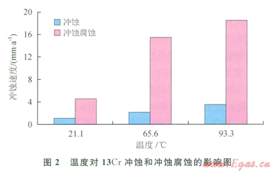 天然氣(無論是否存在固體顆粒)在一定流動速度下將對生產(chǎn)管柱表面造成沖擊從而使油管發(fā)生磨損,高速流動的氣體還足以將油管內(nèi)壁表面黏附不牢的腐蝕產(chǎn)物沖走,或者破壞已形成的保護(hù)性氧化膜,從而加劇腐蝕,降低管柱強(qiáng)度,在往復(fù)的注采過程中將容易導(dǎo)致油管破裂。研究表明:當(dāng)氣體流速低于臨界沖蝕流速時,沖蝕不明顯;當(dāng)氣體流速高于臨界沖蝕流速時,會產(chǎn)生明顯的沖蝕,嚴(yán)重影響氣井的安全生產(chǎn)[9]。另外,隨著溫度的增加,流體對金屬的沖蝕作用和沖蝕腐蝕作用將增強(qiáng)(圖2),因此在設(shè)計時除考慮流速的影響外,還需要考慮溫度的因素。
