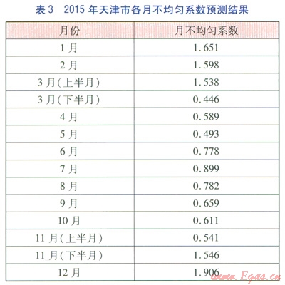2015年天津市各類用戶天然氣用量預(yù)測結(jié)果見表2。由表2可知,2015年最大用氣量將達(dá)到164.02×108m3,并作為計(jì)算2015年季節(jié)調(diào)峰儲(chǔ)氣量的基礎(chǔ)數(shù)據(jù)。2015年天津市各月不均勻系數(shù)預(yù)測結(jié)果見表3,由于3月15日、ll月15日分別為供暖期結(jié)束和供暖期開始時(shí)間,因此這兩個(gè)月的上下半月不均勻系數(shù)變化較大。