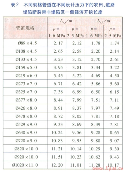 采用前面計(jì)算方法,分別計(jì)算出農(nóng)田、道路塌陷區(qū)對(duì)應(yīng)的上,并將表1數(shù)據(jù)代入式(16),可計(jì)算得不同規(guī)格管道在不同設(shè)計(jì)壓力下農(nóng)田、道路塌陷斷裂帶非塌陷區(qū)一側(cè)經(jīng)濟(jì)開挖長(zhǎng)度Le,t、Le,L,見表2。