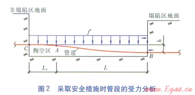 當(dāng)塌陷區(qū)接近或達(dá)到允許沉降量時(shí),點(diǎn)A處的管道將出現(xiàn)失穩(wěn),必須采取安全措施降低當(dāng)量應(yīng)力。安全措施的具體方法為:將管段AB上方的覆土挖走,將土壤荷載卸載。再?gòu)狞c(diǎn)A向塌陷斷裂帶非塌陷區(qū)一側(cè)開挖一段距離到達(dá)點(diǎn)C,并將管段翻下部掏空,以緩解管段AB的彎曲變形,以便較好地應(yīng)對(duì)下一次沉降,將管段下部懸空部分填實(shí)后回填至沉降后地面高度。在實(shí)際操作中我們關(guān)心的是如何確定塌陷斷裂帶非塌陷區(qū)一側(cè)開挖長(zhǎng)度。采取安全措施時(shí)管段的受力分析見圖2。