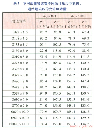 由式(9)~(12)可計(jì)算得到,不同規(guī)格管道在設(shè)計(jì)壓力分別為1.6、2.5MPa下,農(nóng)田、道路塌陷區(qū)的允許沉降量(見表l)。