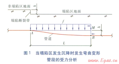 在正常情況下,管道自重(包括供熱介質(zhì)重量)加上部土壤重量等于管道下部土壤的支撐力,無(wú)論是有補(bǔ)償管道還是無(wú)補(bǔ)償管道,管道不會(huì)出現(xiàn)彎曲變形。然而,當(dāng)塌陷區(qū)發(fā)生沉降時(shí),由于管道的連續(xù)性,塌陷斷裂帶的塌陷區(qū)一側(cè)部分管段將發(fā)生彎曲變形(見圖l),并出現(xiàn)懸空現(xiàn)象,使得管道上部出現(xiàn)均布荷載,直至彎曲變形終止。當(dāng)塌陷區(qū)發(fā)生沉降時(shí)發(fā)生彎曲變形管段的受力分析見圖l。