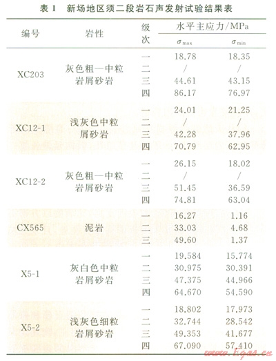 考慮到工區(qū)鉆井的分布,選擇CX565、X5、XC203、XCl2等4口井6組樣品進行了聲發(fā)射實驗;通過單軸應(yīng)力加載,使用聲波檢測儀器接收聲發(fā)射特征參數(shù)(包括聲發(fā)射次數(shù)、事件率和能率),獲得聲發(fā)射特征參數(shù)與加載時間之間的關(guān)系,反映出新場地區(qū)須二段經(jīng)歷了’多期的受力歷史,一般能劃分出3~4級Kaiser效應(yīng)點,至少對應(yīng)了4期破裂歷史(表1)。