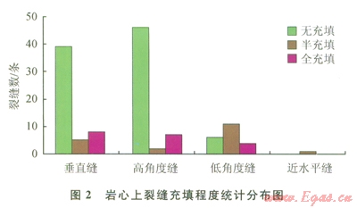 裂縫的充填特征決定了后期裂縫的有效性,對須二段裂縫充填性的統(tǒng)計結(jié)果表明:垂直和高角度裂縫主要為未充填縫,該類裂縫達到70.54%;半充填縫和全充填縫均占l4.73%,全充填裂縫主要為低角度縫。因此從裂縫有效性來看,該區(qū)須二段裂縫有效性高,且有效裂縫主要以垂直縫和高角度縫為主(圖2) [9]。