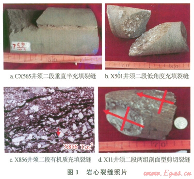 川西新場地區(qū)7口鉆井須二段巖心裂縫觀察描述表明,裂縫產(chǎn)狀主要以高角度縫和垂直縫為主(圖1-a),低角度斜交縫次之(圖1-b),水平縫少見。利用14口井的成像測井資料識別出裂縫的產(chǎn)狀主要存在北東、北西、近南北和東西向4個組系,其中東西向裂縫最為發(fā)育,北東向和近東西向兩個組系裂縫次之,北西向裂縫發(fā)育程度相對最弱;其中東西向優(yōu)勢組系裂縫與該區(qū)現(xiàn)今水平最大主應(yīng)力方位一致[7-8]。