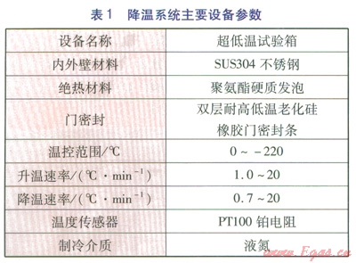 進(jìn)行低溫試驗(yàn)時(shí),爆炸初始溫度低至-170℃,為滿足溫度要求,降溫系統(tǒng)采用超低溫試驗(yàn)箱,液氮冷卻,溫度由智能儀表自動(dòng)控制。降溫系統(tǒng)主要設(shè)備參數(shù)見(jiàn)表1。