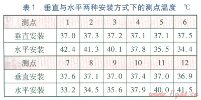 分別對(duì)垂直安裝與水平安裝的供熱管道進(jìn)行測(cè)溫,截面設(shè)12個(gè)測(cè)點(diǎn)(見圖2),12個(gè)測(cè)點(diǎn)均勻分布,測(cè)點(diǎn)與絕熱層外表面的距離為20mm,所選擇的測(cè)溫截面的絕熱材料比較均勻。垂直與水平兩種安裝方式下的測(cè)點(diǎn)溫度見表1。由表1可知:對(duì)于垂直安裝供熱管道,l2個(gè)測(cè)點(diǎn)的平均溫度為37.18℃。對(duì)于水平安裝供熱管道,12個(gè)測(cè)點(diǎn)的平均溫度為37.85℃。對(duì)于兩種安裝方式,雖然測(cè)點(diǎn)平均溫度基本一致,但是水平安裝供熱管道測(cè)點(diǎn)l的溫度最高,比測(cè)點(diǎn)7的溫度高9.2℃,這說明水平安裝供熱管道的絕熱層熱導(dǎo)率有明顯的方向性。