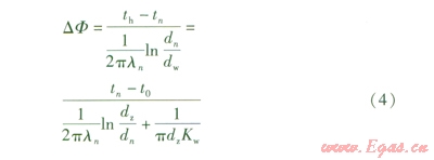 對(duì)于水平安裝供熱管道,設(shè)定絕熱層熱導(dǎo)率與方向無關(guān)且等于測(cè)點(diǎn)n方向的熱導(dǎo)率ln,根據(jù)式(3)與能量守恒定律,以測(cè)點(diǎn)所在圓為分界線,測(cè)點(diǎn)內(nèi)圓絕熱層與測(cè)點(diǎn)外圓絕熱層的熱流量相等。供熱管道單位長(zhǎng)度熱損失DF可寫為: