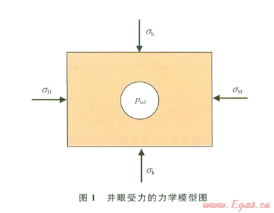 任何一口油氣井鉆開前原地應(yīng)力就已存在于地層巖石中,油氣井眼鉆開后,井內(nèi)流體壓力取代了被鉆巖層提供的支撐,無(wú)疑會(huì)引起井眼周圍巖石應(yīng)力的重新分布[21-22]。假設(shè)井眼周圍的地層為多孔彈性介質(zhì),其應(yīng)力分布可用以下力學(xué)模型求解:在無(wú)限大平面上,一圓孔受均勻的內(nèi)壓,而在這個(gè)平面的無(wú)限遠(yuǎn)處受兩個(gè)水平地應(yīng)力的作用,在垂直方向上受上覆巖層壓力作用,如圖l所示。由于井周地層應(yīng)力最大的點(diǎn)出現(xiàn)在井壁上[23],筆者僅給出了井壁上的應(yīng)力分布公式。直井井壁圍巖有效應(yīng)力為[23]: