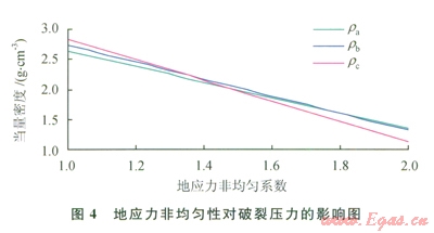 圖7為3種破裂壓力隨孔隙壓力的變化規(guī)律,計(jì)算時(shí)保持構(gòu)造應(yīng)力系數(shù)不變,只改變孔隙壓力的大小。當(dāng)?shù)貙涌紫秹毫Ξ?dāng)量密度由l.0g/cm3 上升到2.0g/cm3時(shí),3種破裂壓力都近似呈線性增大,但rc增長(zhǎng)速率遠(yuǎn)小于ra和rb;當(dāng)孔隙壓力當(dāng)量密度小于1.5g/cm3時(shí),井壁首先發(fā)生A型剪切破裂;當(dāng)孔隙壓力當(dāng)量密度大于1.5g/cm3時(shí),首先發(fā)生拉伸破裂,即孔隙壓力越大發(fā)生拉伸破裂的可能性越大。