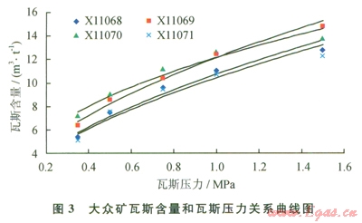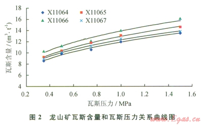 3)實(shí)驗(yàn)室研究了瓦斯含量和瓦斯壓力的相互關(guān)系,龍山礦無(wú)煙煤瓦斯壓力0.74MPa對(duì)應(yīng)的瓦斯含量為l0.9~12.6m3/t,最低為l0.9m3/t;大眾礦貧煤對(duì)應(yīng)的瓦斯含量為9.04~10.7m3/t,最低為9.04m3/t。