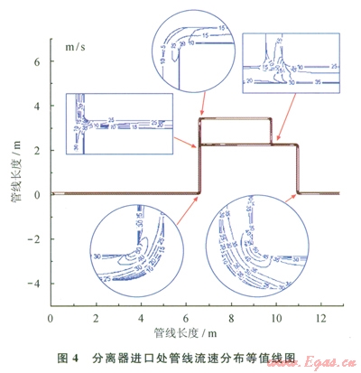 介質(zhì)在管道輸運(yùn)過(guò)程中,由于其內(nèi)部流道的變化,局部的流速會(huì)遠(yuǎn)遠(yuǎn)高于整體流速,加之紊流作用影響,因此必定會(huì)加劇影響腐蝕速率。圖1所示管線的內(nèi)流場(chǎng)模擬結(jié)果見(jiàn)圖4、5所示。