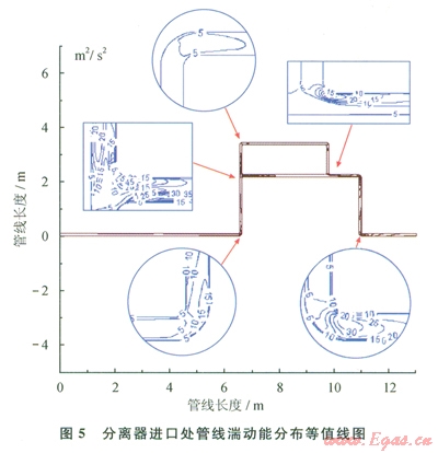 由于結(jié)構(gòu)的變化,彎頭迎著來(lái)流方向的內(nèi)弧面首先承受流體的沖刷,且流體速度達(dá)到最大,表明該位置的沖刷破壞危險(xiǎn)性較高。與此同時(shí),彎頭迎流側(cè)中上部位置形成局部湍流,湍流強(qiáng)度有明顯增強(qiáng),湍流動(dòng)能數(shù)在彎頭區(qū)域處達(dá)到最大值75m2/s2(圖5)。由于流體的慣性作用,流體沿著彎頭的弧度向前流動(dòng),正對(duì)著來(lái)流方向的彎頭外弧面上方的直管段位置,也承受了較大的沖刷作用;T形管內(nèi)最大流速發(fā)生在來(lái)流支管主流區(qū)域和與主流管道垂直的支管道內(nèi)遠(yuǎn)離主流一側(cè)的區(qū)域,而與主流方向一樣的另一條支管道內(nèi)的流速則相對(duì)平緩。同時(shí),渦流程度也在垂直主管道的支管道中靠近主流的一側(cè)以及支管道與主管道銜接部位的拐角處有了較大提高,湍流動(dòng)能數(shù)也達(dá)到了該管線的峰值。