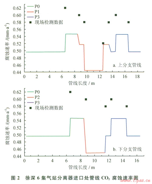 由計(jì)算數(shù)據(jù)可以得出,在管道的人口水平管道處,平均腐蝕速率保持在0.49mm/a,隨著流體介質(zhì)從L0管段流入Ll管段,管道由水平管段轉(zhuǎn)為鉛直管段,平均腐蝕速率升高,保持在0.55mm/a。在第一個(gè)T形管處管段的腐蝕速率有了一定程度的變小,L2與L4鉛直管線的腐蝕速率減至0.52mm/a,L3與L5水平管線的腐蝕速率減至0.45mm/a。在第二個(gè)T形管處介質(zhì)流體合流,腐蝕速率也增至0.50mm/a,在L7段處的管道鉛直下降,腐蝕速率升到0.55mm/a,最后在L8管段處達(dá)到穩(wěn)定。按照NACE標(biāo)準(zhǔn)RP-0775-91[12]中對(duì)腐蝕程度的規(guī)定,該條集氣站管線腐蝕率大于0.254mm/a,已發(fā)生極嚴(yán)重腐蝕。中國(guó)特種設(shè)備檢測(cè)研究院于2011年利用OLYMPUS 38DLPLUS超聲波測(cè)厚儀對(duì)該管線的重點(diǎn)管段處(彎頭及T形管)進(jìn)行檢測(cè),由于重點(diǎn)管段處的腐蝕情況略高于平均腐蝕預(yù)測(cè)率,故該模擬結(jié)果與現(xiàn)場(chǎng)工況的檢測(cè)結(jié)果較吻合[13],從而說(shuō)明本文采用模擬方法是可行的,為下面繼續(xù)分析CO2分壓對(duì)腐蝕速率的影響奠定基礎(chǔ)。
