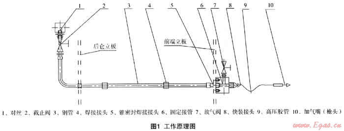 該裝置原理為利用長管拖車氣瓶內(nèi)天然氣和牽弓車儲(chǔ)氣瓶內(nèi)天然氣的壓力差,通過快裝接頭和管道,把長管拖車內(nèi)的高壓天然氣充注入牽引車儲(chǔ)氣瓶中,以達(dá)到持續(xù)補(bǔ)氣、續(xù)駛里程的目的。