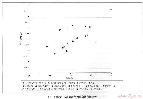 圖1列出了上海與廣東省一些氣源的華白數(shù)和燃燒勢(shì),其整體變化并不大,除LNG富組分外均落在國(guó)標(biāo)12T范圍之內(nèi)(華白數(shù)45.67~54.78MJ/m3,燃燒勢(shì)36.3~69.3,圖1中兩條直線中間的范圍即為國(guó)標(biāo)中12T的華白數(shù)范圍。)。其中最貧的是川氣,最富的是珠海LNG富氣(表1)。若按照95%的CH4純度來(lái)配制川氣和珠海LNG(富),即單一氣體CH4含有95%的CH4和5%的C2H6,則配制的川氣和珠海LNG(富)之華白數(shù)將增加,分別為49.22和53.93,偏差為1.73%和1.3%。顯然,若考察不同來(lái)源天然氣的組分不同所導(dǎo)致的燃?xì)饩咝阅茏兓?.73%和1.3%的偏差無(wú)法滿(mǎn)足實(shí)驗(yàn)要求,必須采用精確的配氣方法。