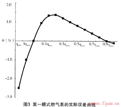 理想情況下燃?xì)獗碛?jì)量誤差是零,但是流量計(jì)均存在實(shí)際誤差曲線。按照設(shè)計(jì)圖生產(chǎn)的一批燃?xì)獗恚`差曲線應(yīng)該是一樣的,但是,因?yàn)閷?shí)際生產(chǎn)工藝、裝配等因素影響,實(shí)際上每一臺(tái)表的誤差曲線是不同的[2]。圖3為某一膜式燃?xì)獗淼膶?shí)際典型的誤差曲線,其中橫坐標(biāo)x軸為檢定的流量點(diǎn),縱坐標(biāo)Y軸為相對(duì)誤差值(%)。